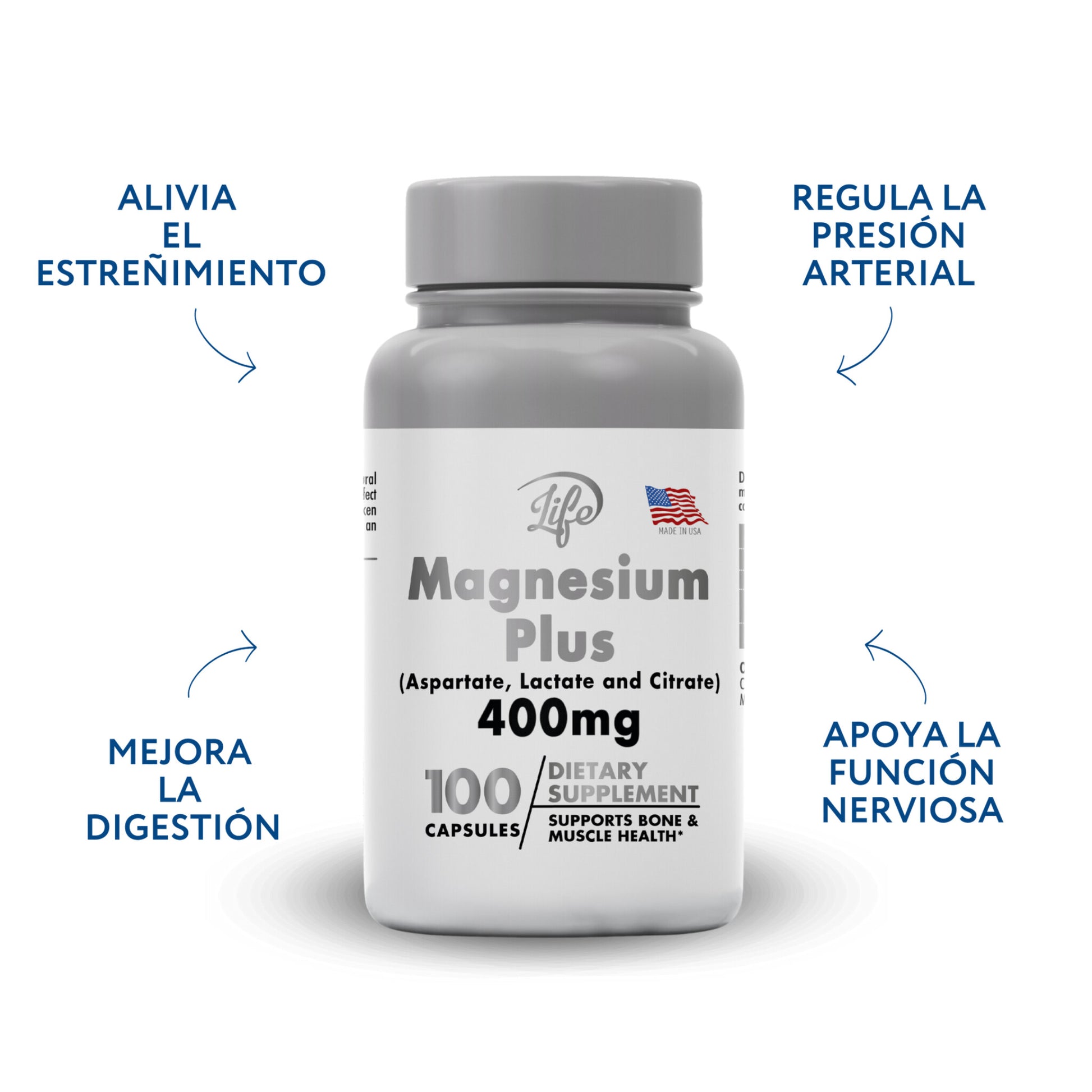 Contiene 400 mg de magnesio en forma de aspartato, lactato y citrato, presentado en cápsulas.